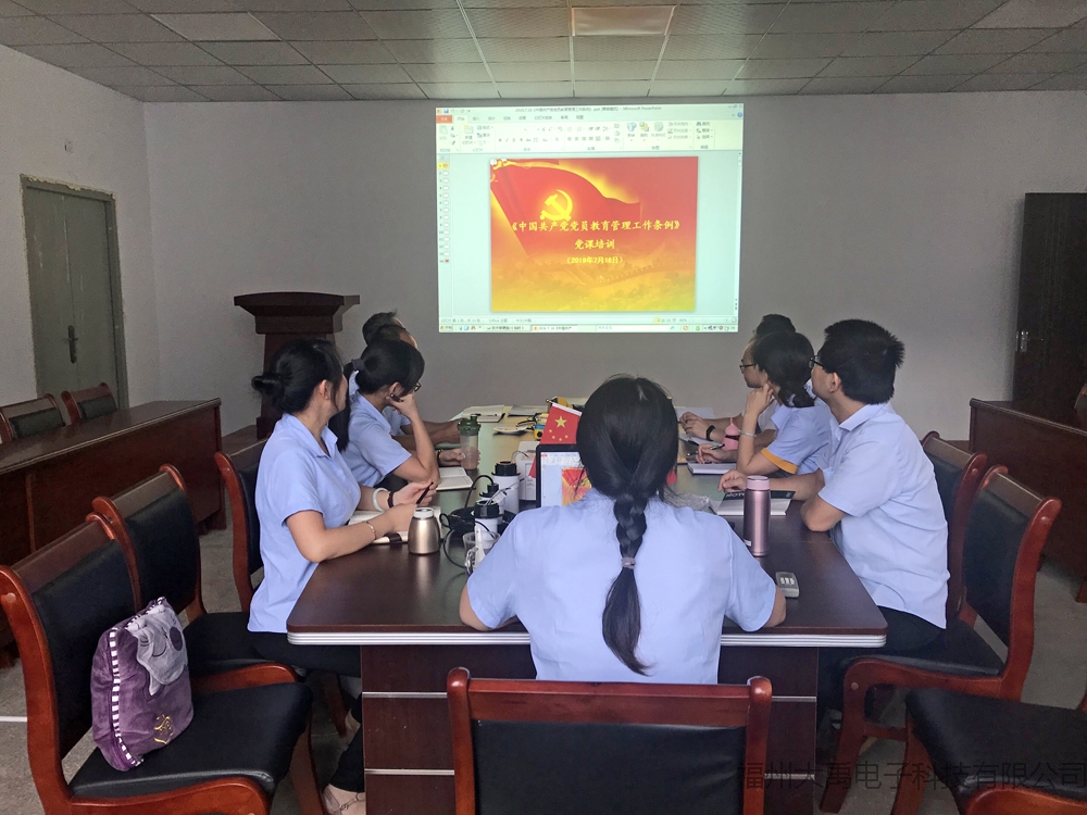 公司黨支部組織黨員開展學習《中國共產黨黨員教育管理條》 根據中共福州市晉安區鼓山鎮福興經濟開發區黨工委的統一部署,中共福州大禹電子科技有限公司黨支部于2019年7月18日下午,在公司黨支部會議室召集黨員和入黨積極分子共同學習《中國共產黨黨員教育管理條例》。 會議由支部書記黃麗清同志主持...